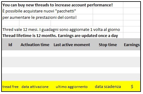 Nella pagina seguente troveremo lo schema dei treads dove ci sarà quello gratuito che abbiamo attivato e sarà definito dal colore giallo e sopra il quale verranno indicati poi quelli che acquisteremo.